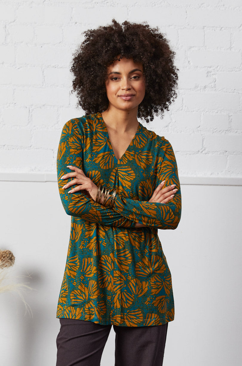 Consciously made using sustainable fabric Ecovero, which drapes beautifully, this pleated top has a stand collar and a swing shape to its fit, making it great for daytime dressing. It comes in two sumptuous colours.