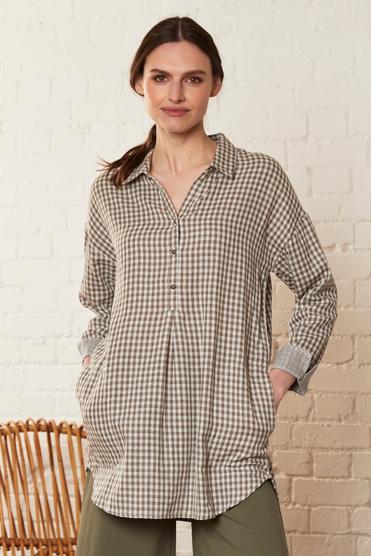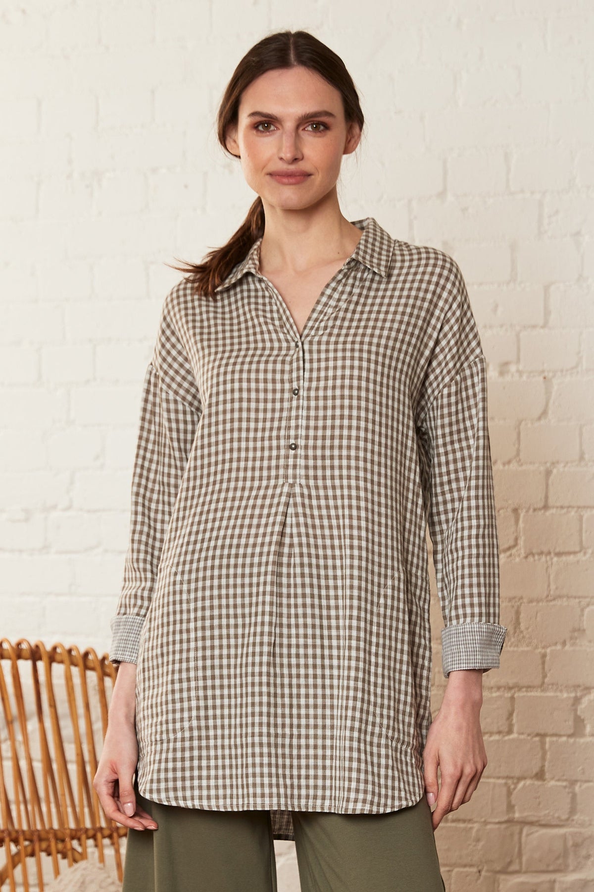 An updated colour of our best selling style, this tunic shirt is crafted in neutrally toned oatmeal and fits nicely into our loungewear collection. Designed with a scooped hem, contrast roll-up cuffs and pewter dome buttons, this has all the features you loved before in a refreshing new colour.